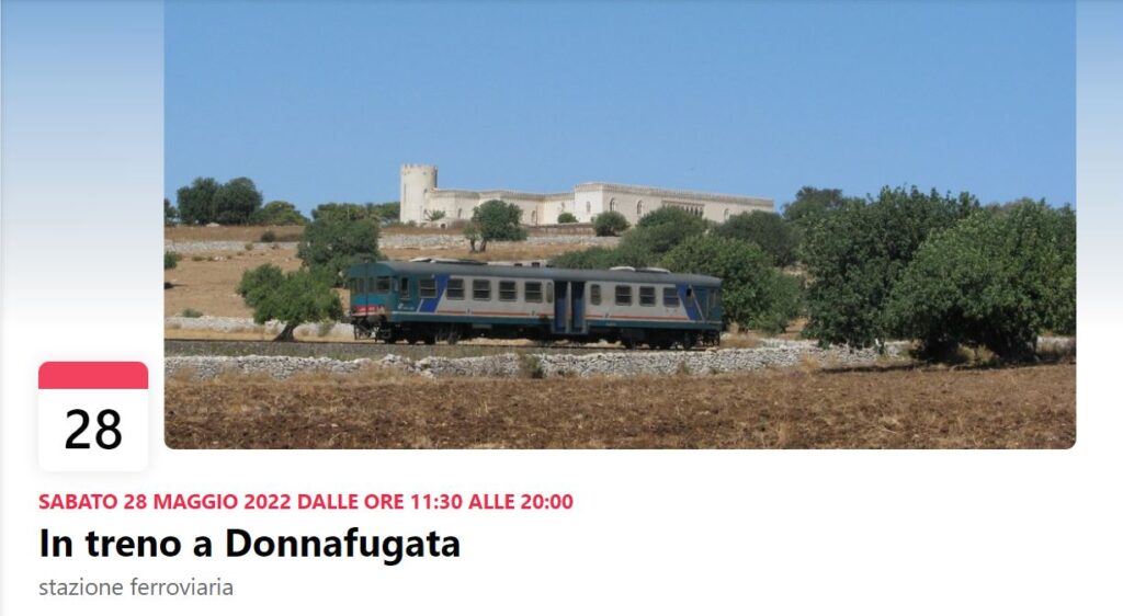 L’ecomuseo Carat è fatto di relazioni , consapevolezza, valorizzazione del nostro territorio: la ferrovia ed il castello di Donnafugata sono tra i fiori all’occhiello di questo progetto. Spostarsi in treno per comprenderne il valore e le potenzialità. Rivedere insieme un luogo noto, per apprezzare i lavori di riqualificazione del giardino, il Mu.de.co., l’esposizione temporanea. Stare insieme, camminare, conoscersi o rivedersi. Fare comunità. Questo, e molto altro nell’escursione organizzata dall’Associazione Insieme In Città per il giorno 28 di maggio 2022.